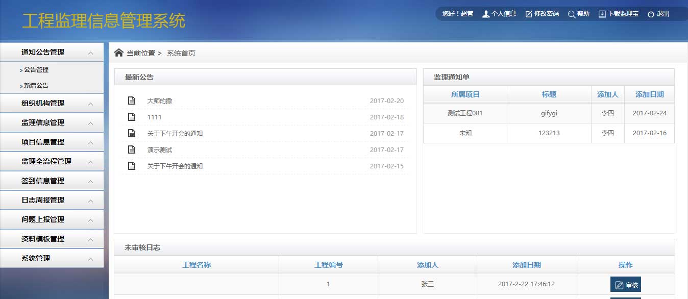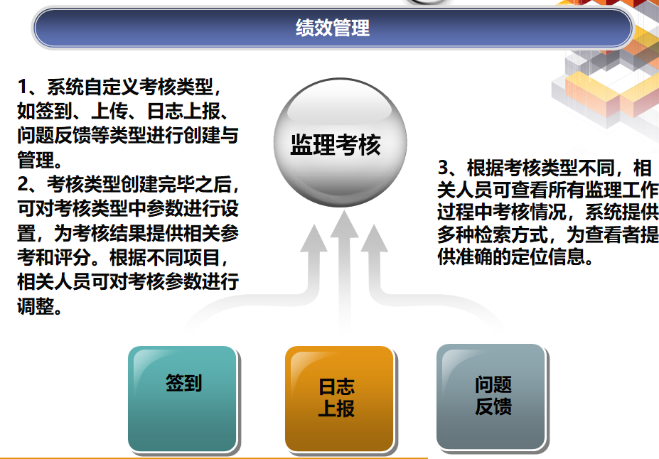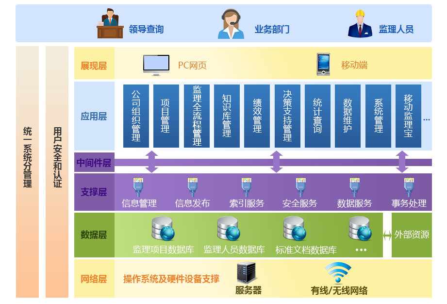 工程監理信息管理系統結合監理公司實際業務,以項目管理為核心,以企業經營管理為主線,以工程進度為驅動,以現場監理服務實施為重點,從監理企業領導戰略層面、管理/監理機構層面、現場監理咨詢人員層面,推進工作流程系統化、規范化、科學化,實現監理工作管、控、用一體化。提高監理公司、管理機構及現場監理人員的綜合管理能力和監理服務水平,提高監理服務品質,提升業主滿意度和核心競爭力。