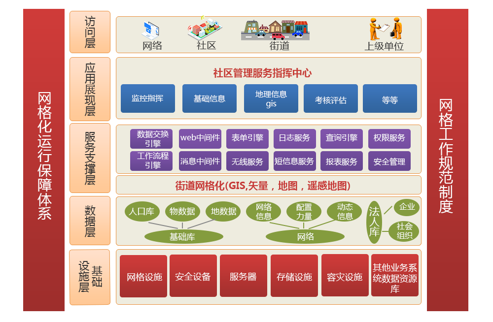 社會管理網格化GIS系統由1個門戶網站、1個網格化管理平臺(含30多個子系統)、GIS三維地圖、無線移動終端(Andriod+IOS)等4個整體框架構成建設,實現創新型社會管理服務體系的科學化和人性化。